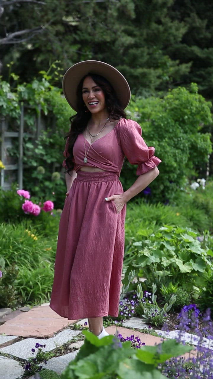 The Jolene Jolene Dress is all your favorite trends wrapped into one! With details like the puff sleeves accompanied by ruffle cuffs, a wrap style front that ties in the back, cut out detail under the bust, and flowy midi length skirt, this will become your new go to!